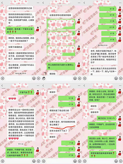 在这套亲密关系修复体系中,需要天天给予百分百的配合执行。而天天在配合过程中,虽然遇到阻碍,比如,内心的委屈,老公态度依然不满。但在我的指导和安抚下,张峰对天天的态度发生了大转变!由于篇幅有限,具体的指导不作详细叙述。每一位用户的遭遇、性格、理解能力均不同,因此方案也是不同的,切勿随意套用。一般来说,原则上将心比心、以心换心、精诚所至、金石为开,总能收获幸福!