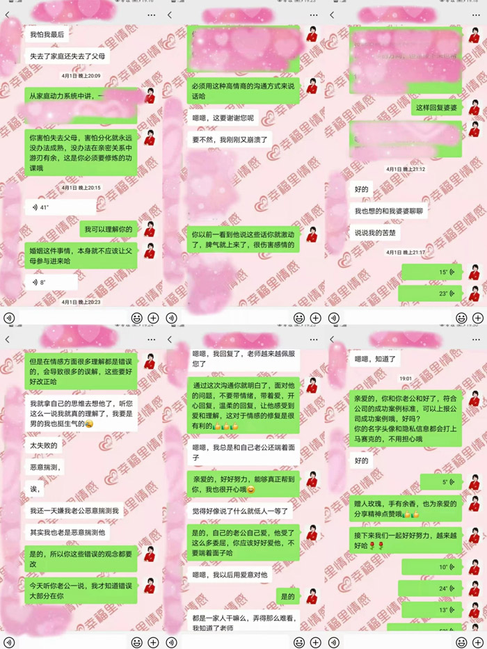 她舍不得,也觉得对不起孩子,万般无奈之下来求助。在挽回的过程中,委托人多次情绪崩溃,哭泣,说坚持不下去想放弃。老师一路陪伴指导,终于老公和小三断了,回归家庭和她好好过日子。